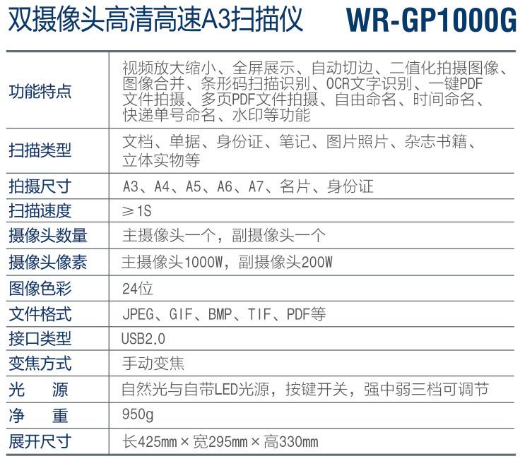 WR-GP1000G雙攝像頭高清高速A3掃描儀