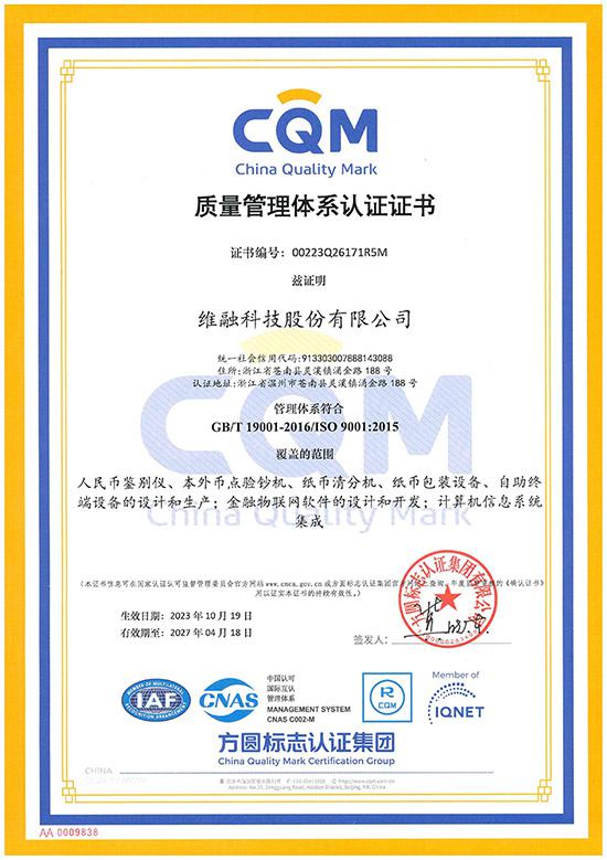 質(zhì)量管理體系CQM認(rèn)證證書(shū)