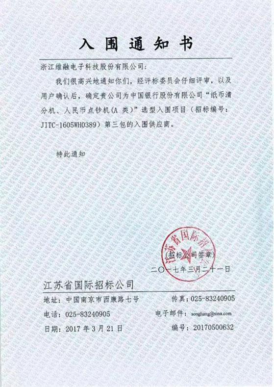 近日,我公司收到江蘇省國際招標(biāo)公司發(fā)出的《入圍通知書》。在中國銀行股份有限公司“紙幣清分機(jī)、人民幣點鈔機(jī)(A類)”選型入圍項目(招標(biāo)編號:JITC-1605WH0389)中,經(jīng)評標(biāo)委員會仔細(xì)審查,以及用戶確認(rèn)后,確定維融科技股份有限公司為第三包的入圍供應(yīng)商,入圍產(chǎn)品為紙幣清分機(jī)、人民幣點鈔機(jī)(A類) 。