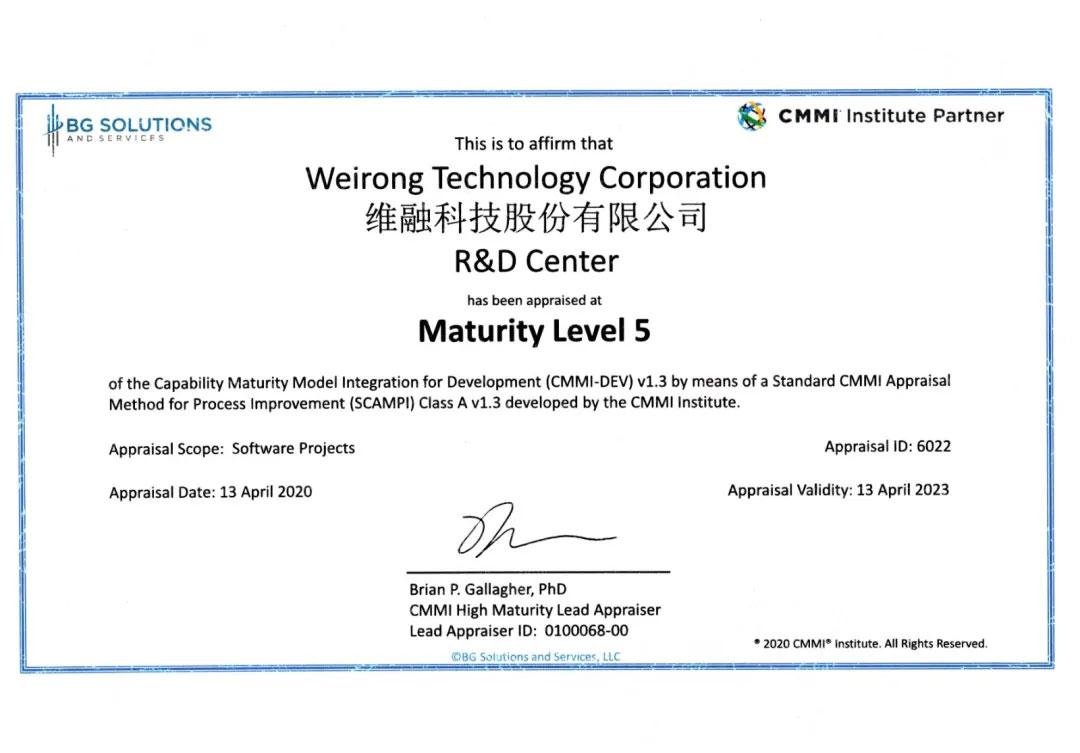 2020年4月13日,維融科技股份有限公司正式通過CMMI5級評估認(rèn)證,標(biāo)志著公司在軟件過程組織、技術(shù)研發(fā)、項目管理、方案交付等方面達(dá)到了國際先進(jìn)水平。?