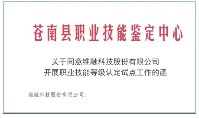 9月9日,蒼南縣職業(yè)技能鑒定中心發(fā)文同意維融科技開(kāi)展職業(yè)技能(計(jì)算機(jī)及外部設(shè)備裝配調(diào)試員、信息通信網(wǎng)絡(luò)終端維修員兩個(gè)工種)等級(jí)認(rèn)定試點(diǎn)工作。
